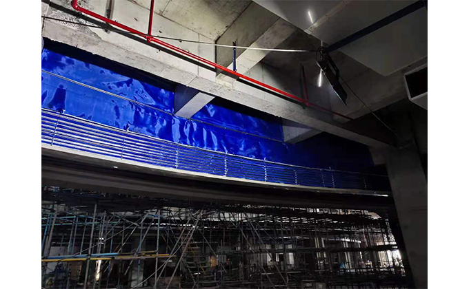 擋煙垂簾垂壁根據設計要求和現場實際情況采取如下施工順序:首先,搭設腳手架一放線一打眼--上脹栓一焊骨架。第二,吊件一安裝骨架…